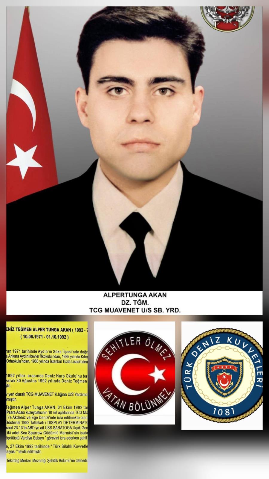 Deniz Teğmen Alper Tunga AKAN, 01 Ekim 1992 tarihinde Ege Denizi Psara Adası kuzeybatısının 10 mil açıklarında TCG MUAVENET (DM-357)'e Akdeniz ve Ege Denizi'nde icra edilmekte olan " NATO Kararlılık Gösterisi 1992 Tatbikatı (DISPLAY DETERMIΝΑΤΟΝ - 92)" sırasında, saat 23.13'te ABD'ye ait USS SARATOGA Uçak Gemisi'nden ateşlenen iki adet Sea Sparrow Güdümlü Mermisi'nin isabet etmesi sonucu "Köprüüstü Vardiya Subayı " görevini icra ederken şehit olmuştur.